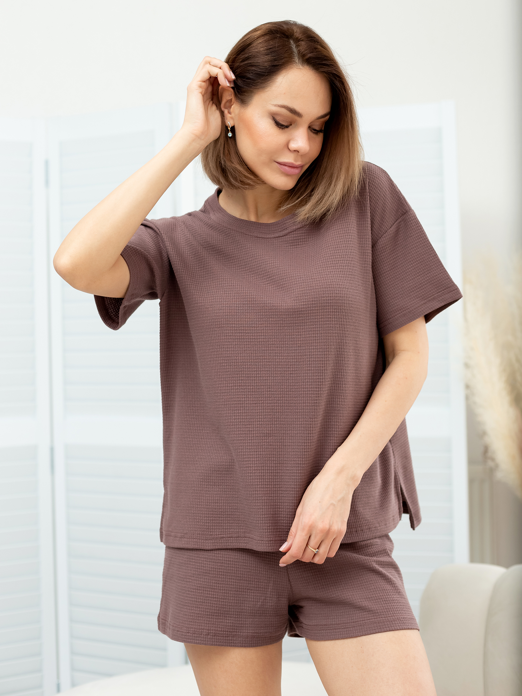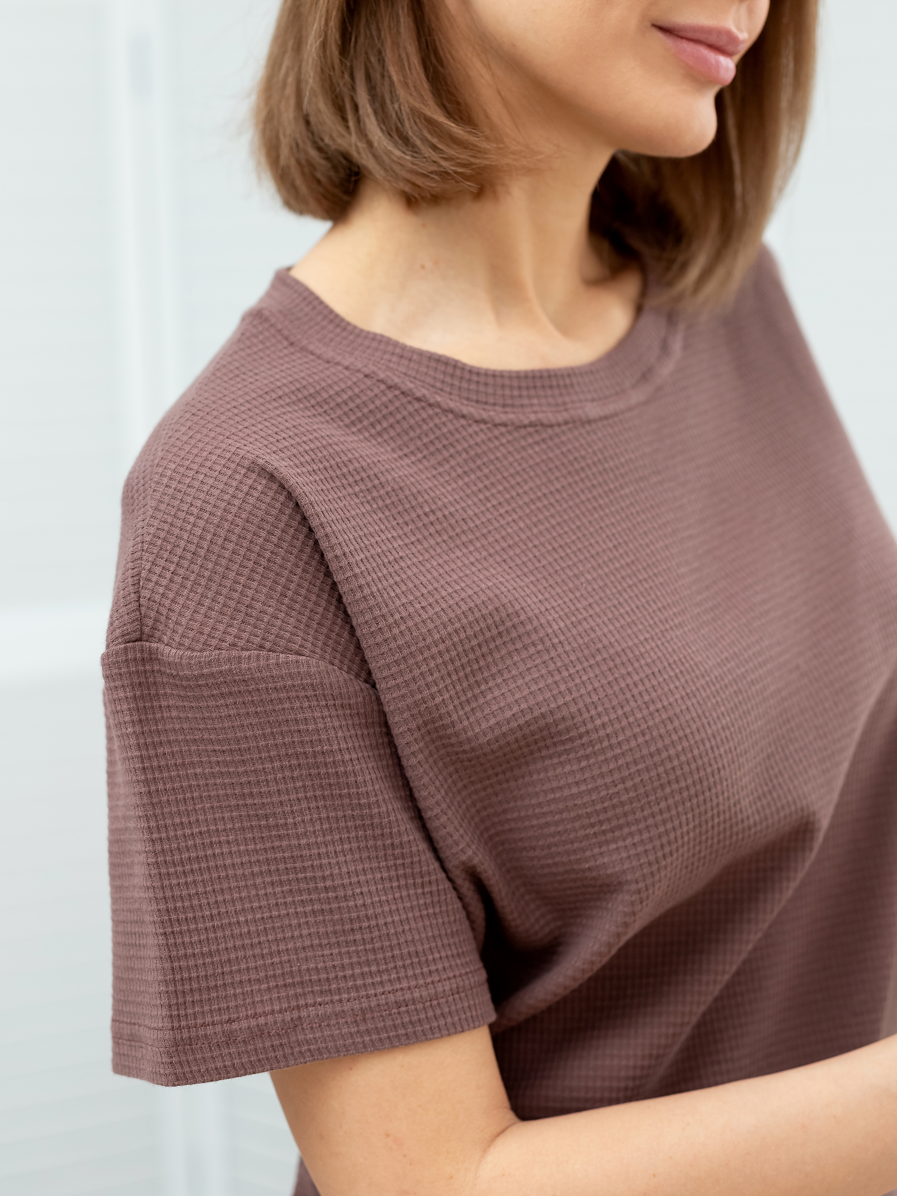 Стильная футболка женская оверсайз свободного кроя с разрезами по бокам из хлопкового трикотажного полотна 100% хлопок вафля кашкорсе.